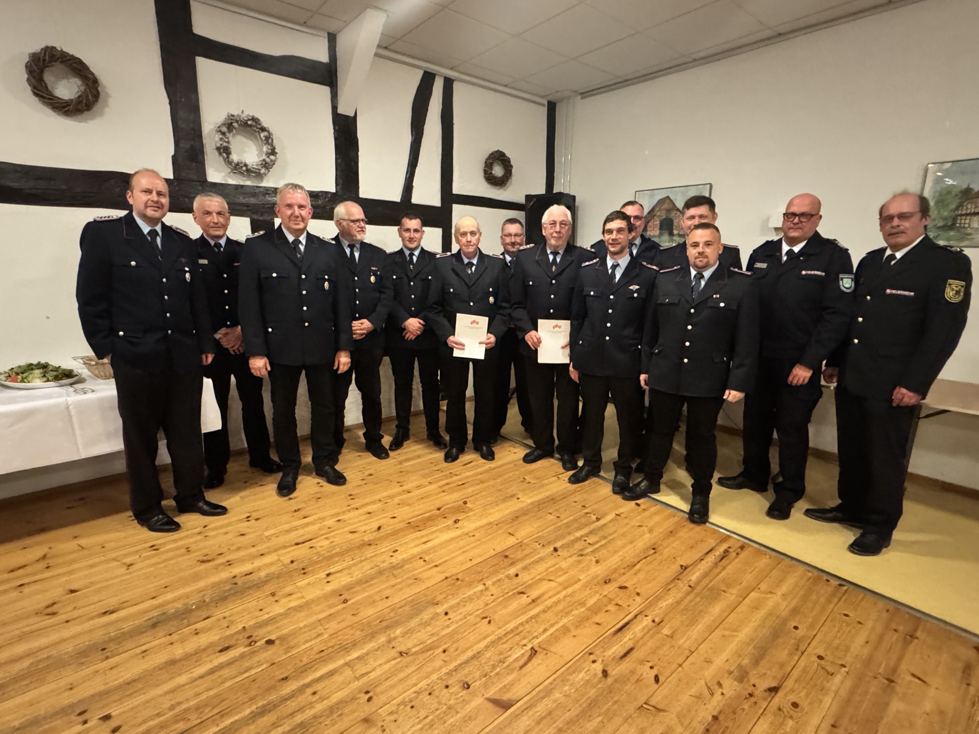 Während der Versammlung wurden mehrere Mitglieder befördert. Zum Oberfeuerwehrmann wurden Hauke Frick, Christoph Klose, Julien Meyer, Michael Bluoss und Mark Baker ernannt. André Buckwitz und Oliver Groß wurden zum Brandmeister befördert. Für langjährige Mitgliedschaft wurden Birger Lerch für 40 Jahre sowie Markus Frick für 50 Jahre in der Feuerwehr geehrt. Für 60-jährige Mitgliedschaft wurden Friedrich Hoffmeyer, Manfred Fiedler und Jürgen Beermann ausgezeichnet. Eine besondere Würdigung erfuhr Birger Lerch für seine 30jährige Tätigeit als Schriftführer, inklusiver eines kleinen Geschenkes. Als sein Nachfolger wurde Hauke Frick einstimmig gewählt.